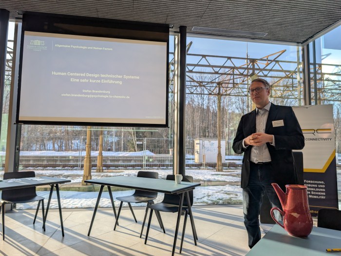 Am Montag, den 19.01.2026, konnten sich die Teilnehmenden bei einem gemeinsamen Get-Together-Dinner in Chemnitz kennenlernen. Am Dienstag, den 20.01.2026, folgte dann der erste Programmtag im Campusgebäude des SRCC am Unteren Bahnhof Annaberg-Buchholz mit einem bunten Mix aus Besichtigungs-, Vortrags-, Workshop-, und Diskussionsteilen. Ein gemeinsames Abendessen in der Annaberger Altstadt bot genug Raum für vertiefende Gespräche. Am Mittwoch, den 21.01.2026 wurde das erneut gemischte Arbeitsprogramm im IdeenReich der Universitätsbibliothek der TU Chemnitz fortgesetzt. Zwei Workshops am Dienstag und Mittwoch beleuchteten jeweils das Themenfeld der Zusammenarbeit zwischen Mensch und automatisierten Fahrzeugsystemen am konkreten Fallbeispiel der Teleoperation von Schienenfahrzeugen. Sie rückten die nutzendenzentrierte Gestaltung und die Ableitung von Anforderungen an entsprechende Systeme in den Mittelpunkt.