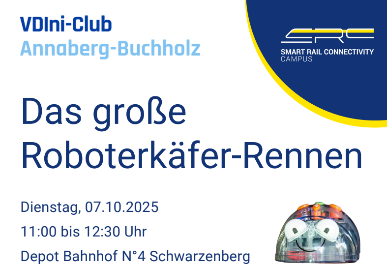 News Kick-Off RailInnoHUB SN-CZ Weiterlesen ... 17 Okt. 2025 LCX4Rail Testfahrt Weiterlesen ... 10 Okt. 2025 Rückblick: DZM-Vernetzungskonferenz 2025 Weiterlesen ... 02 Okt. 2025 Innovation auf der Schiene: kompakt, interdisziplinär und praxisnah – die… Weiterlesen ... 26 Sep. 2025 Auf die Käfer, fertig, los! Weiterlesen ... 25 Sep. 2025 Rückblick: Europatreffen & AHK on Stage Weiterlesen ... 06 Sep. 2025 Helfer für Digital Rail Convention 2025 gesucht Weiterlesen ... 15 Aug. 2025 Digital Rail Convention: Tickets und Programm online Weiterlesen ... 01 Juli 2025 Rückblick: DZM-Standorte auf dem UITP Summit 2025 in Hamburg Weiterlesen ... 01 Juli 2025 Rückblick: Hot Topic Seminar in Hamburg Weiterlesen ... 19 Juni 2025 Rückblick: InnoDay 2025 am RailCampus OWL in Minden Weiterlesen ... 16 Mai 2025 Rückblick: Tschechisch-Deutscher F&E-Kooperationsworkshop „Smart Rail Mobility“ Weiterlesen ... 08 Mai 2025 Veranstaltunshinweis: Indoor-Navigation für das automatisierte Fahren Weiterlesen ... 25 Apr. 2025 Rückblick: Technikwerkstatt „Gemeinsam zum EscapeTrain“ Weiterlesen ... 23 Apr. 2025 Deutsches Zentrum für Schienenverkehrsforschung zu Gast in Annaberg-Buchholz am SRCC! Weiterlesen ... 14 Apr. 2025 Komm in unser Team! Weiterlesen ... 30 März 2025 Veranstaltungshinweis: Smart Rail Enquete 2025 Weiterlesen ... 26 Feb. 2025 Rückblick: DZM-Winterschool in Karlsruhe Weiterlesen ... 24 Feb. 2025 Rückblick: Folgeworkshop – Ladeinfrastruktur für Akkumulatorzüge Weiterlesen ... 13 Feb. 2025 Call for exhibition! – Digital Rail Convention 2025 Weiterlesen ... 13 Feb. 2025 Rückblick: Projekt-Kick-off „Amazing-6G” Weiterlesen ... 12 Feb. 2025 Rückblick: Multiplikatoren-Exkursion am Campus zum Thema „Mobilität der Zukunft aus… Weiterlesen ... 27 Jan. 2025 Umfrage: Bedürfnisse und Hindernisse bei der Wahl eines bahnspezifischen Studiengangs Weiterlesen ... 14 Jan. 2025 Rückblick: SRCC als AdventsKulTürchen Weiterlesen ... 08 Jan. 2025 Veranstaltungshinweis: Humanist Conference 2025 – Innovative and intelligent mobility solutions… Weiterlesen ... 08 Jan. 2025 Rückblick: Roboter-Käferrennen mit Vorschulkindern Weiterlesen ... 07 Jan. 2025 Onlineumfage zur Mobilität im Erzgebirgskreis Weiterlesen ... 06 Jan. 2025 Weihnachtliches Netzwerk- und Mitgliedertreffen 11.12.2024 Weiterlesen ... 13 Dez. 2024 Unterstützung und Fundstücke für MINT-Werkstatt gesucht Weiterlesen ... 11 Dez. 2024 Fördermittel für Forschungshalle in Annaberg-Buchholz bewilligt Weiterlesen ... 11 Dez. 2024 Veranstaltungshinweis: Folgeworkshop – Ladeinfrastruktur für Akkumulatorzüge Weiterlesen ... 10 Dez. 2024 Rückblick: Nikolausfahrt 2024 Weiterlesen ... 09 Dez. 2024 Rückblick: Hot Topic Seminar im Rahmen des Deutschen Zentrums Mobilität… Weiterlesen ... 06 Dez. 2024 Veranstaltungshinweis: Nikolausfahrt am 06.12.24 Weiterlesen ... 21 Nov. 2024 Veranstaltungshinweis: SRCC-Weihnachtstreffen am 11.12.2024 Weiterlesen ... 19 Nov. 2024 Rückblick: Projekttag mal anders! Weiterlesen ... 11 Nov. 2024 Rückblick: Dialogveranstaltung „Connectivity“ Weiterlesen ... 11 Nov. 2024 Rückblick: Abschlussworkshop zum Projekt „5G4Rail“ Weiterlesen ... 11 Nov. 2024 Rückblick: Ferienausflug ins Schüler-Lab der WHZ Weiterlesen ... 21 Okt. 2024 Call for workstreams! – Digital Rail Convention 2025 Weiterlesen ... 21 Okt. 2024 Rückblick: Das große Roboterkäfer-Rennen in Schwarzenberg am 8. Oktober 2024 Weiterlesen ... 09 Okt. 2024 Rückblick: SRCC auf der InnoTrans 2024! Weiterlesen ... 09 Okt. 2024 Veranstaltungshinweis: Save the Date! Digital Rail Convention 2025 Weiterlesen ... 30 Sep. 2024 Rückblick: Außergewöhnlicher Besuch am Smart Rail Connectivity Campus! Weiterlesen ... 30 Sep. 2024 Rückblick: DZM Vernetzungskonferenz Weiterlesen ... 18 Sep. 2024 Rückblick: Für MINT begeistern Weiterlesen ... 13 Sep. 2024 Veranstaltungshinweis: Das große Roboterkäfer-Rennen in Schwarzenberg Weiterlesen ... 06 Sep. 2024 Veranstaltungshinweis: Ferienausflug ins Schüler-Lab der Westsächsischen Hochschule Zwickau 16.10.24 Weiterlesen ... 20 Aug. 2024 Rückblick: Erfolgreiches Sommerfest und Netzwerktreffen 2024 Weiterlesen ... 14 Aug. 2024 Rückblick: Ferienwerkstatt „Gemeinsam zum EscapeTrain“ Weiterlesen ... 13 Aug. 2024 Umfrage: Ihre Meinung ist uns wichtig! Weiterlesen ... 19 Juli 2024 Rückblick: Streckenstammtisch in Schwarzenberg Weiterlesen ... 11 Juli 2024 Rückblick zur Premiere: Zertifikatskurs „Grundlagen des Bahnbetriebs“ vom 01.-05. Juli… Weiterlesen ... 09 Juli 2024 Rückblick: BlueBots bei der Makers United Weiterlesen ... 27 Juni 2024 Veranstaltungshinweis: Sommerfest – 07.08.2024 Weiterlesen ... 13 Juni 2024 Veranstaltungshinweis: Ferienausflug ins Schüler-Lab der Westsächsischen Hochschule Zwickau Weiterlesen ... 31 Mai 2024 Informationsveranstaltung zur Ferienwerkstatt für Technikfans – EscapeTrain Weiterlesen ... 28 Mai 2024 Rückblick: Workshop zur Bedarfserhebung für (Weiter-)Bildungsangebote für den Bahnsektor Weiterlesen ... 28 Mai 2024 Veranstaltungshinweis: Streckenstammtisch in Schwarzenberg am 12.06.2024 Weiterlesen ... 24 Mai 2024 Rückblick: Auftaktveranstaltung des Deutschen Zentrums Mobilität der Zukunft (DZM) Weiterlesen ... 20 Mai 2024 Information: Zertifikatskurs “Grundlagen des Bahnbetriebs” Weiterlesen ... 11 Apr. 2024 Rückblick: Smart Rail Enquete 2024 on tour Weiterlesen ... 11 Apr. 2024 Rückblick: Großes Oster-Käferrennen Weiterlesen ... 05 Apr. 2024 Rückblick: Ergebnisworkshop – (Autonome) On-Demand-Mobilität auf dem Land Weiterlesen ... 05 Apr. 2024 Innovationscluster SET4FUTURE sucht zukunftsweisende Produkte und Lösungen aus der Bahnindustrie! Weiterlesen ... 22 März 2024 Rückblick: Workshop – Ladeinfrastruktur für Akkumulatorzüge Weiterlesen ... 18 März 2024 Veranstaltungshinweis: Große Oster-Käferrennen für Kinder Weiterlesen ... 13 März 2024 Wir stellen ein! Weiterlesen ... 28 Feb. 2024 Eröff